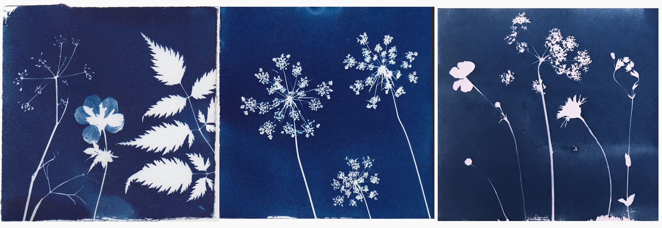 When I arrive in a new place, I look to the hedgerows, fields and verges to see who else is here. The plants I find help me orientate myself in a new place, telling me about the soil, season, climate. This ongoing series of cyanotypes documents these encounters. Often made outside, and complete with brush marks, finger prints, and other marks from the making, they do not record specimen so much as form part of my ongoing exploration of my relationship with nature.