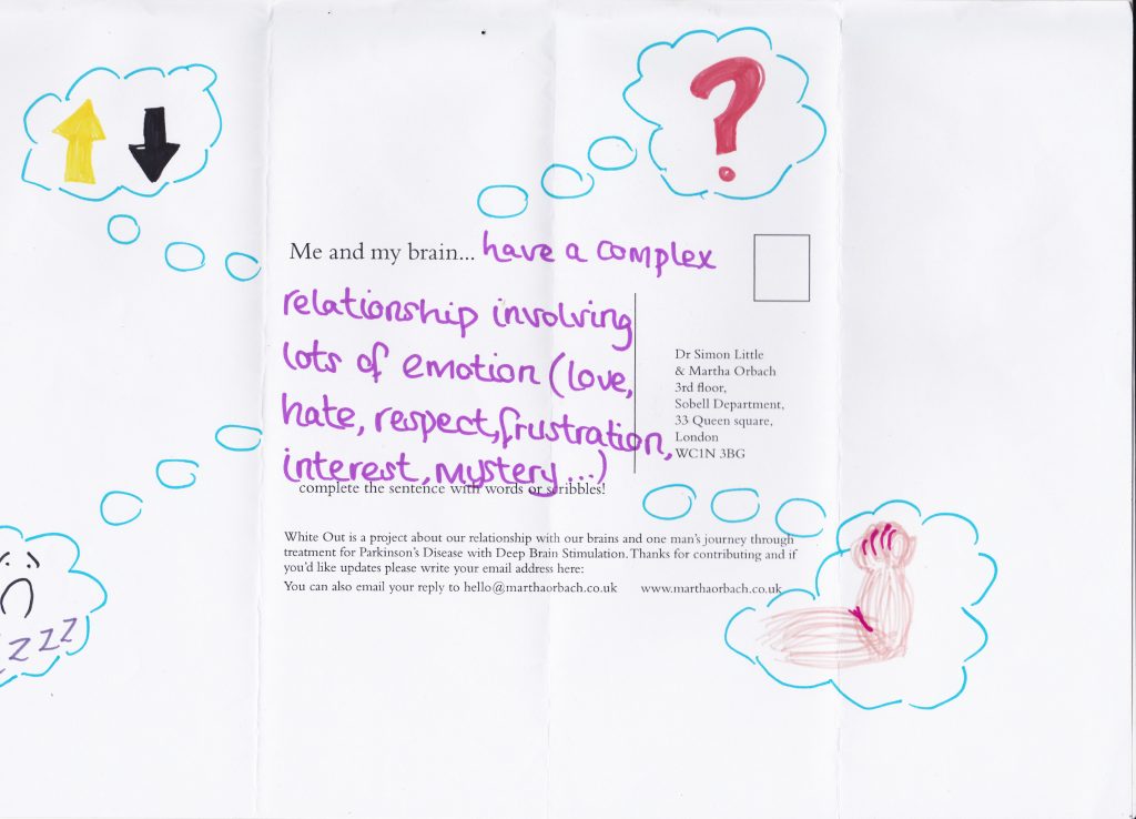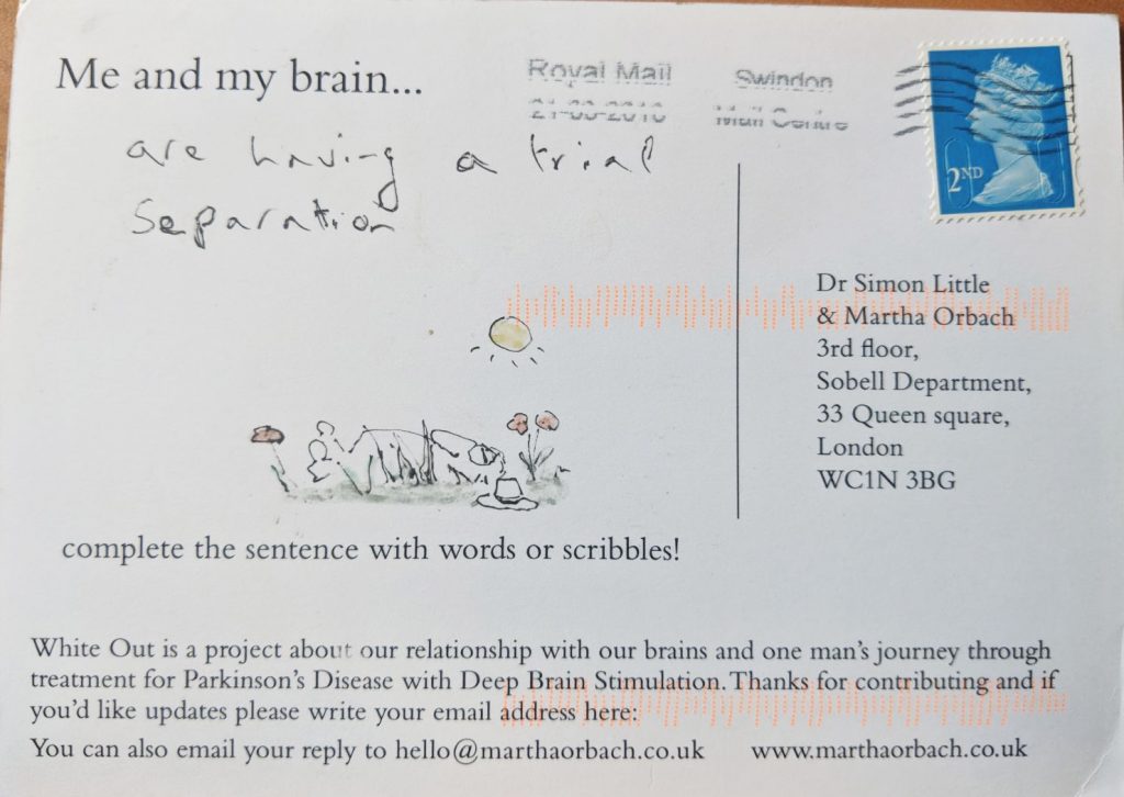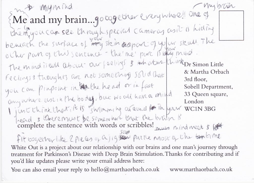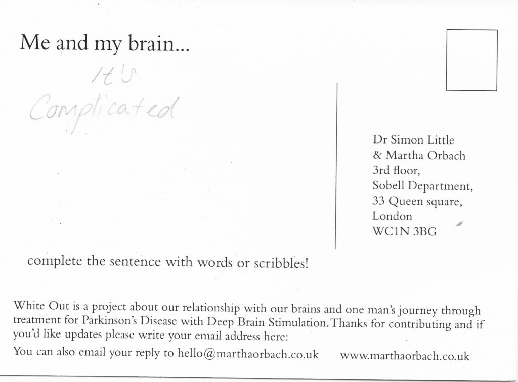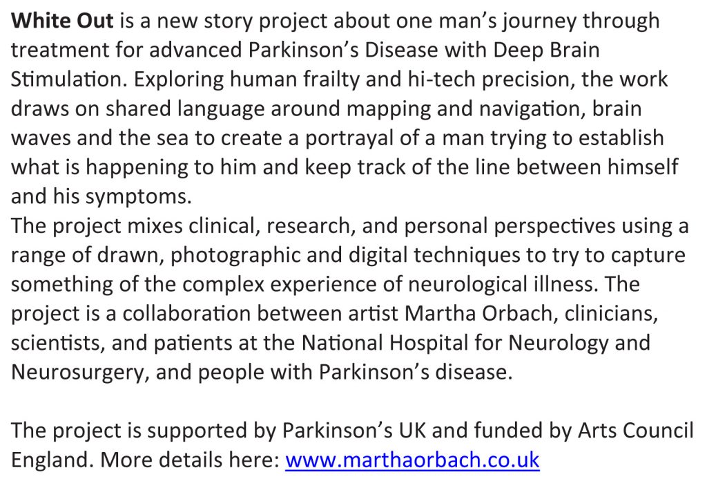“Art was never a consideration. I was merely having life changing surgery. I was completely detached from the reality of the situation, completely calm as I contemplated having holes drilled into my skull and wires inserted into my brain. So an artist wanted to watch my operation? Rather her than me.”